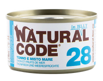 NATURAL CODE 28 tuno ir jūros gėrybių konservai katėms, 85 g