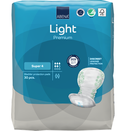 "Abena Light Super 4 Premium" – anatominės formos įklotai skirti esant lengvam arba vidutiniam šlapimo nelaikymui, (su lipnia juostele pritvirtinimui).