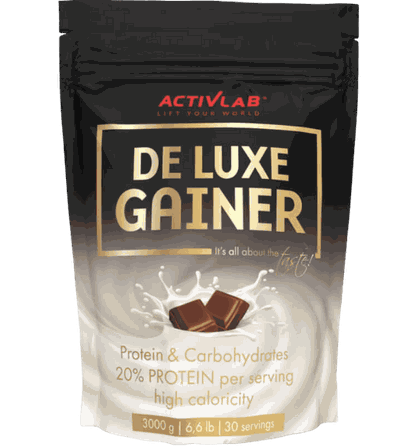 Activlab De Luxe Gainer 3000g. Baltymų ir angliavandenių mišinys kokteiliui ruošti su saldikliais. Pakuotės dydis: 3000 g Maistinė/energinė vertė: Viena porcija (100 g + 200 ml vandens) Energinė vertė (kcal) 1658 kJ / 391 kcal Riebalai 2,3 g iš kurių sotieji 1,5 g Angliavandeniai 72 g iš kurių cukrūs 11 g Baltymai 20 g Druska 0,27 g Sudedamosios dalys: Braškės skonio: maltodekstrinas, išrūgų baltymų koncentratas (iš pieno), pasukų milteliai (iš pieno), kvapiosios medžiagos, braškių milteliai 0,1%, tirštiklis: ksantano derva, saldiklis: sukralozė, dažiklis: burokėlių sulčių koncentratas. Vanilės skonio: maltodekstrinas, išrūgų baltymų koncentratas (iš pieno), pasukų milteliai (iš pieno), kvapiosios medžiagos, vanilės milteliai 0,1%, tirštiklis: ksantano derva, saldiklis: sukralozė, dažiklis: karotinai. Šokolado skonio: maltodekstrinas, išrūgų baltymų koncentratas (iš pieno), pasukų milteliai (iš pieno), kakavos milteliai, kvapiosios medžiagos, 0,1% šokolado drožlės, tirštiklis: ksantano derva, saldiklis: sukralozė, dažiklis: amoniako karamelė. Alergenai: gali būti grūdų, kuriuose yra glitimo, sojos pupelių darinių. Vartojimas: sumaišykite 100g (4 kaušelius) su 200 ml vandens arba pieno. Vartoti vieną kartą per dieną tarp valgių arba po treniruotės. Įspėjimai: nevartoti, jei esate alergiškas bet kuriai iš produkto sudedamųjų dalių. Netinka nėščioms ar krūtimi maitinančioms moterims. Produktas neturi būti vartojamas kaip maisto pakaitalas. Neviršyti nustatytos rekomenduojamos dozės. Laikyti sausoje, vėsioje, vaikams nepasiekiamoje vietoje, saugoti nuo tiesioginių sauės spindulių. Geriausias iki (termino pabaigos): datos nurodytos ant pakuotės. Partija: žr. ant pakuotės. Gamintojas: UNIPRO Sp. z o. o., Targowisko 553, 32-015 Kłaj, Lenkija.