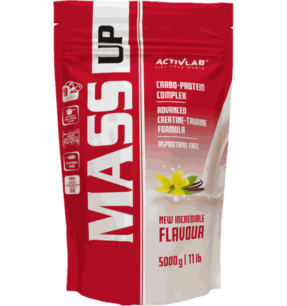 Activlab Mass Up 5000 g. Baltymų ir angliavandenių milteliai kokteiliui ruošti su saldikliais. Grynasis kiekis: 5000 g Maistingumo deklaracija Dienos porcija (100 g + 200 ml vandens) Energinė vertė 1668 kJ / 393 kcal Riebalai 0,5 g Iš kurių sočiųjų 0,1 g Angliavandeniai 87 g Iš kurių cukraus 17,5 g Baltymai 10 g Druska 0,10 g Kreatinas 2 g Taurinas 2 g Mėlynių, Vanilės skoniai: Maistingumo deklaracija Dienos porcija (100 g + 200 ml vandens) Energinė vertė 1688 kJ / 397 kcal Riebalai 0,6 g Iš kurių sočiųjų 0,4 g Angliavandeniai 88 g Iš kurių cukraus 5 g Baltymai 10 g Druska 0,10 g/0,70 g* Kreatinas 2 g Taurinas 1 g *Sūdytos karamelės skonio Kavos skonio: Maistingumo deklaracija Dienos porcija (100 g + 200 ml vandens) Energinė vertė 1688 kJ / 397 kcal Riebalai 0,6 g Iš kurių sočiųjų 0,4 g Angliavandeniai 88 g Iš kurių cukraus 5 g Baltymai 10 g Druska 0,10 g Kreatinas 2 g Taurinas 1 g Sudedamosios dalys: maltodekstrinas, išrūgų baltymų koncentratas (iš pieno), kreatino monohidratas, taurinas, kvapiosios medžiagos, kakava 0,1% (šokolado skonio), tirpi kava 0,1% (kavos skonio), vanilės milteliai 0,1% (vanilės skonio), džiovintų bananų tyrė 0,1% (bananų skonio), ananasų sulčių milteliai 0,1% (ananasų skonio), persikų sulčių milteliai 0,1% (persikų skonio), mėlynių sulčių milteliai 0,1% (mėlynių skonio), braškių sulčių milteliai 0,1% (braškių skonio), sviesto milteliai 0,1% (sausainių skonio), kokosų pieno milteliai 0,1% (kokosų skonio), rūgštingumą reguliuojanti medžiaga - citrinos rūgštis (ananasų, persikų, mėlynių, braškių skoniams), dažikliai: saulėlydžio geltonasis FCF (persikų skonio), *košenilio raudonasis (persikų skonio), karotenas (ananasų skonio), karminas (braškių, mėlynių skonio), amoniakinė karamelė (šokolado, kavos, sausainių skonio), briliantinis mėlynasis FCF (mėlynių skonio), titano dioksidas (kokosų skonio), tirštiklis - ksantano derva, saldikliai: sukralozė ir acesulfamas K. *Saulėlydžio geltonasis ir košenilio raudonasis gali neigiamai paveikti vaikų aktyvumą ir dėmesį. Alergenai: gali būti grūdų, kuriuose yra glitimo, sojos. Vartojimas: 100 g miltelių (4 kaušeliai) ištirpinkite 200 ml vandens arba pieno. Naudokite vieną kartą per dieną, geriausia tarp valgių arba po fizinio krūvio. Įspėjimai: nevartoti, jei esate alergiškas bet kuriai iš produkto sudedamųjų dalių. Netinka nėščioms ar krūtimi maitinančioms moterims. Produktas neturi būti vartojamas kaip maisto pakaitalas. Neviršyti nustatytos rekomenduojamos dozės. Laikyti sausoje, vėsioje, vaikams nepasiekiamoje vietoje, saugoti nuo tiesioginių saulės spindulių. Geriausias iki (termino pabaigos): datos nurodytos ant pakuotės. Partija: žr. ant pakuotės. Gamintojas: UNIPRO Sp. z o. o., Targowisko 553, 32-015 Kłaj, Lenkija. Platintojas: MB „Biceps“. Kauno g. 30, parduotuvė "MrBiceps", Vilnius. www.MrBiceps.lt. Tel. : +37064621250