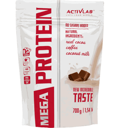 Activlab Mega protein 700g. Baltyminiai milteliai kokteiliui ruošti, su saldikliais. Sudėtyje yra kofeino (40mg/33g (kavos skonyje) ir 25mg/33g (moka kavos ir tiramisu skoniuose)). Nerekomenduojama vaikams ir nėščioms moterims. Activlab Mega protein - tai aukštos kokybės baltymų šaltinis, kuris padės išsaugoti raumenų masę. Net 2g kreatino vienoje porcijoje Su kofeinu (kavos, moka kavos ir tiramisu skoniuose) bei taurinu Sudėtyje yra kakavos bei kokosų pieno Net 70% baltymų