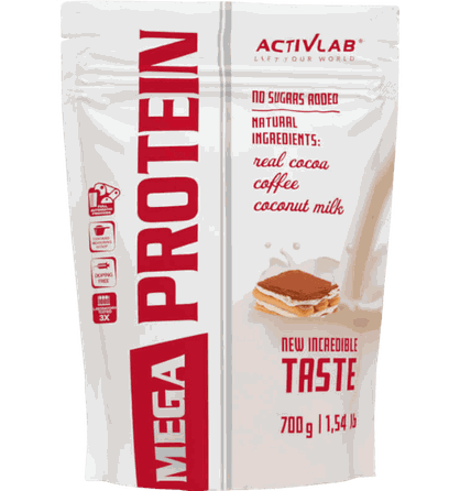 Activlab Mega protein 700g. Baltyminiai milteliai kokteiliui ruošti, su saldikliais. Sudėtyje yra kofeino (40mg/33g (kavos skonyje) ir 25mg/33g (moka kavos ir tiramisu skoniuose)). Nerekomenduojama vaikams ir nėščioms moterims. Activlab Mega protein - tai aukštos kokybės baltymų šaltinis, kuris padės išsaugoti raumenų masę. Net 2g kreatino vienoje porcijoje Su kofeinu (kavos, moka kavos ir tiramisu skoniuose) bei taurinu Sudėtyje yra kakavos bei kokosų pieno Net 70% baltymų