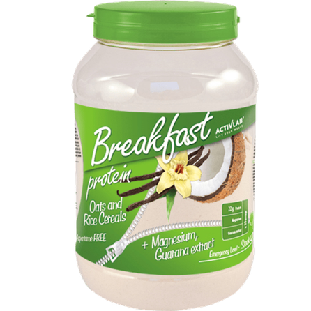 Activlab Protein Breakfast 1000g. Baltymų ir angliavandenių milteliai kokteiliui ruošti su saldikliais. Sudėtyje yra kofeino (22 mg/100 g). Nerekomenduojama vaikams ir nėščioms moterims. Grynasis kiekis: 1000 g Maistingumo deklaracija Dienos porcija (100 g + 200 ml vandens) Energinė vertė 1577 kJ / 372 kcal Riebalai 2,2 g Iš kurių sočiųjų 0,3 g Angliavandeniai 66 g Iš kurių cukraus 12,4 g Baltymai 22 g Druska 1 g Magnis 120 mg (32%*) Guaranos ekstraktas 100 mg iš kurio kofeino 22 mg *referencinės maistinės vertės Sudedamosios dalys: Maltodekstrinas, išrūgų baltymų koncentratas, gliukozė, avižų dribsniai, ryžių dribsniai, rūgštingumą reguliuojanti medžiaga: citrinų rūgštis, tirštikliai: E466 ir E1422, kvapiosios medžiagos, magnio karbonatas, emulsiklis: sojų lecitinas, guaranos sėklų ekstraktas (Paullinia cupana), dažikliai: E124 (braškių, jogurto ir vyšnių skonio, miško vaisių skonio), E150c (šokolado skonio), E171 (kokosų ir vanilės skonio), E133 (miško vaisių skonio), saldiklis: E950. Alergenai: pienas, avižos, soja. Sudėtyje gali būti glitimo turinčių grūdų, sojos, pieno darinių. Vartojimas: Ištirpinkite 100 g (4 šaukštelius) miltelių su 200 ml vandens. Vartokite kartą per dieną, geriausia ryte per pusryčius Įspėjimai: nevartoti, jei esate alergiškas bet kuriai iš produkto sudedamųjų dalių. Netinka nėščioms ar krūtimi maitinančioms moterims. Produktas neturi būti vartojamas kaip maisto pakaitalas. Neviršyti nustatytos rekomenduojamos dozės. Laikyti sausoje, vėsioje, vaikams nepasiekiamoje vietoje, saugoti nuo tiesioginių saulės spindulių. Geriausias iki (termino pabaigos): datos nurodytos ant pakuotės. Partija: žr. ant pakuotės. Gamintojas: UNIPRO Sp. z o. o., Targowisko 553, 32-015 Kłaj, Lenkija. Platintojas: MB „Biceps“. Kauno g. 30, parduotuvė "MrBiceps", Vilnius. www.MrBiceps.lt. Tel. : +37064621250