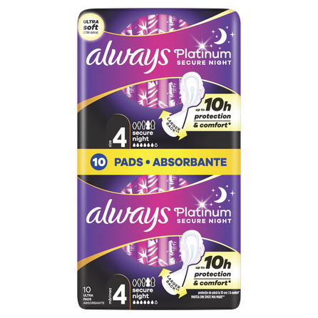 <p>Always Platinum higieniniai paketai sukurti taip, kad suteiktų beveik šimtaprocentę apsaugą nuo pratekėjimo, pasislinkimo ir diskomforto. Su Always Platinum paketais galite miegoti be rūpesčių. </p><p>Always Platinum Secure Night, 4 dydis, turi net 60 % ilgesnę nugarėlę, todėl suteikia didesnę apsaugą ten, kur jos labiausiai reikia. Palyginti su Always Platinum Normal, 1 dydžiu.</p>