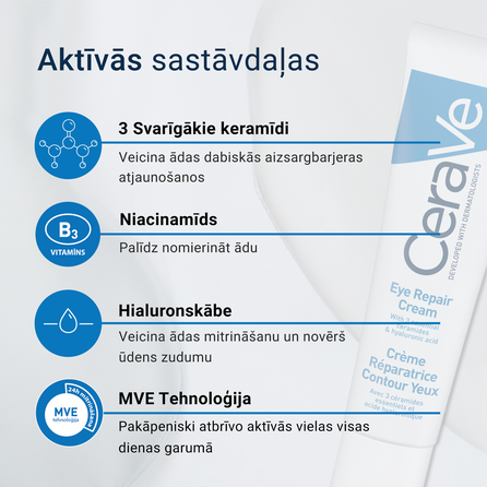<p>Atkuriamasis normalios ir sausos odos paakių kremas. Drėkina ir atgaivina švelnią paakių odą. </p><ul><li>Pastebimai mažina ratilus ir patinimus po akimis. </li><li>Sudėtyje yra drėkinamosios hialurono rūgšties, kuri išlygina smulkias linijas ir stangrina odą. </li><li>Sudėtyje esantys trijų pagrindinių rūšių keramidai skatina natūralaus odos apsauginio barjero atsinaujinimą. </li><li>Su MVE technologija, kuri visą dieną palengva išskiria veikliąsias medžiagas.</li></ul>