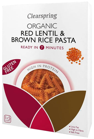 „Clearspring“ raudonųjų lęšių ir rudųjų ryžių makaronai be glitimo – maistinga alternatyva kvietiniams makaronams.