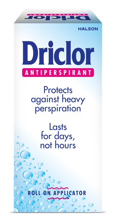 <p>Antiperspirantas, apsaugantis nuo pernelyg didelio pažastų, delnų ir pėdų prakaitavimo. </p><p>„Driclor“ sudėtyje yra 20 proc. aliuminio chlorido druskos. Poveikis išlieka ne kelias valandas, o netgi kelias dienas. Po savaitės naudojimo prakaitavimas sumažėja 50 proc. </p><p><span style="font-weight: bold;">Veikimo būdas: </span></p><ul><li>Priemonė sukuria gelio pavidalo barjerą prakaito liaukose, sumažina ir galiausiai sustabdo prakaito išsiskyrimą. </li><li>Prakaitas sugeriamas atgal į organizmą ir pašalinamas iš jo įprastu būdu. </li><li>Tinka visų tipų odai.</li><li> Gali naudoti visi, kuriems nepadeda įprasti antiperspirantai.</li></ul>