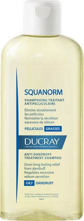 DUCRAY SQUANORM šampūnas nuo sausų pleiskanų, 200 ml yra gydomasis šampūnas, rekomenduojamas žmonėms, kurie kenčia nuo pleiskanų bei riebios galvos odos ir niežulio.