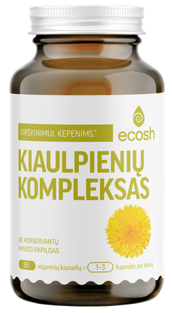 ECOSH Kiaulpienių komplekso sudėtyje - paprastųjų kiaulpienių šaknų ir žiedų milteliai bei šaknų ekstraktas. Vienoje kapsulėje net 200 mg kiaulpienių šaknų ekstrakto, 200 mg kiaulpienių šaknų miltelių ir 30 mg kiaulpienių žiedų miltelių.