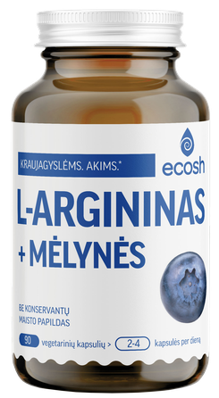 <div>ECOSH maisto papildo sudėtyje – aminorūgštis L-argininas ir liofilizuotų mėlynių uogų milteliai. L-argininas yra sąlygiškai nepakeičiama aminorūgštis, naudojama baltymų biosintezei.</div><div><br></div><ul><li>Mėlynės padeda palaikyti normalią gliucidų, lipidų ir baltymų apykaitą.</li><li>Mėlynės padeda palaikyti normalią gliukozės koncentraciją kraujyje bei normalią kraujagyslių funkciją.</li><li>Mėlynės padeda apsaugoti ląsteles nuo oksidacinės pažaidos bei padeda išsaugoti normalų regėjimą.</li></ul><div>Europos Maisto Saugos Tarnybos (EFSA) leistini naudoti sveikatingumo teiginiai.</div><div><br></div><div>ECOSH – Estijos maisto papildų gamintojas, siekiantis gaminti kuo natūralesnius, kokybiškus ir efektyvius maisto papildus. Naudojamos vegetarinės kapsulės, maisto papildai yra be konservantų, dauguma tinkami vegetarams.</div><div><br></div><div><br></div>