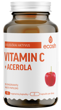 ECOSH biologiškai aktyvus vitaminas C – su Acerolos (kraštuotųjų malpigijų) uogų milteliais. Biologiškai aktyvi forma – greičiau ir labiau įsisavinama.