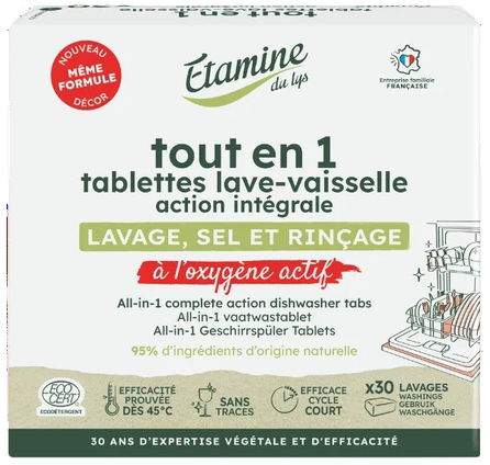 „Etamine du Lys“ sujungė indų plovimo, nukalkinimo (druskos) ir skalavimo funkcijas į vieną tabletę! Indaplovei prižiūrėti nereikia naudoti papildomų priemonių. Vienas skalbimas – viena tabletė. Be kvapų.