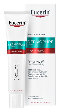 Eucerin® DermoPure Clinical raminamasis kremas į aknę linkusiai odai. Kliniškai įrodyta, kad jis palaiko odos barjerą, naudojant vaistus nuo aknės, kurie sausina odą. Su Symsitive™ ir keramidais, pasižyminčiais dilgčiojimą, deginimo pojūtį ir niežėjimą malšinančiomis savybėmis.