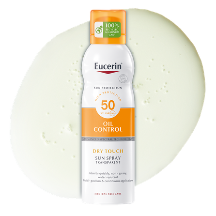 Eucerin® Sun Oil Control Dry Touch skaidrus purškalas SPF 50 yra kūnui skirtas purškalas, tinkantis jautriai, taip pat į aknę linkusiai odai. Purškia nepertraukiamai, laikant įvairiomis padėtimis, todėl yra itin patogus naudoti, ypač sunkiai pasiekiamoms kūno vietoms.