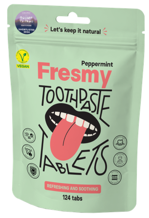 Fresmy dantų pastos tabletėse yra hidroksiapatito (HAp), netoksiškos fluoro alternatyvos, kuri natūraliai atkuria dantų emalį, ir postbiotikų, padedančių palaikyti subalansuotą pH lygį burnoje bei sukurti gerą terpę naudingosioms bakterijoms.