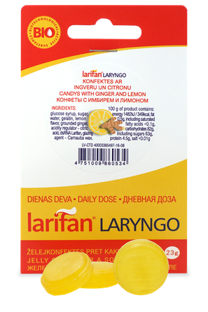 Larifan Laryngo Laim Peppermint – tai želė tipo pastilės, skirtos palengvinti gerklės sudirgimą ir uždegiminius procesus burnos ertmėje bei ryklėje. Jose esantis patentuotas natūralios kilmės komponentas dsRNR Larifan padeda palaikyti gleivinės apsaugines funkcijas ir saugo nuo aplinkos veiksnių, ypač virusų ir mikroorganizmų patekimo per burnos gleivinę.
