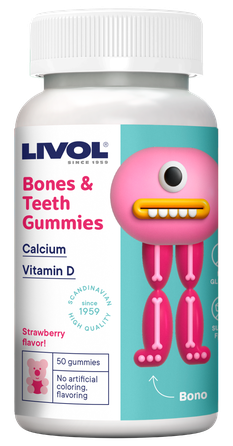 LIVOL Bones & Teeth guminukai – aukštos skandinaviškos kokybės kalcio ir vitamino D guminukai kaulams ir dantims.