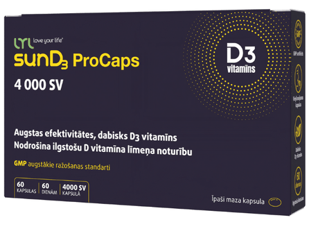 LYLsunD3 ProCaps greitai padidina bendrą vitamino D kiekį kraujyje, užtikrindamas ilgalaikį bendro vitamino D kiekio stabilumą ir saugų šio produkto vartojimą. Mažos, lengvai nuryjamos kapsulės.