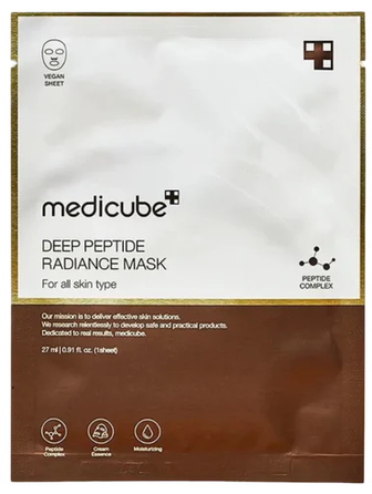 Medicube Deep Peptide Radiance Mask – tai veiksminga lakštinė kaukė su aukšto funkcionalumo peptidine kremo esencija. Formulėje – Quadruple Peptide ir hialurono rūgštis, padedantys didinti drėkinimą ir elastingumą spindinčiai odai. Jau viena kaukė gali suteikti raukšlių, elastingumo ir drėgmės pagerėjimo efektą.