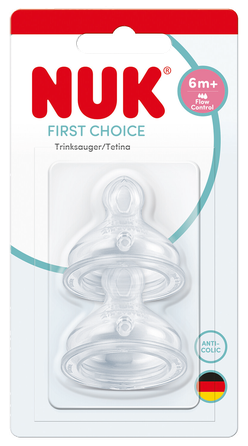 NUK „First Choice+“ silikoninis žindukas, kuris užtikrina natūralų pojūtį geriant. Jis suformuotas taip, kad atitiktų žandikaulio kontūrus. M dydžio žinduko anga (pieno mišiniui). Kūdikiams nuo 6 iki 18 mėnesių amžiaus.