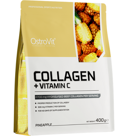 OstroVit Collagen + Vitamin C 400g. Kolageno milteliai, su saldikliais. Grynasis kiekis: 400 g (40 porcijų). Maistinė vertė: 10 g 100 g Hidrolizuotas jautienos kolagenas 8 700 mg 87 000 mg Vitaminas C 500 mg 625%* 5 000 mg *RMV% - referencinė maistinė vertė Beskonis: Maistinė vertė: 100 g Vienoje porcijoje RMV%* Hidrolizuotas jautienos kolagenas 95 000 mg 9 500 mg - Vitaminas C 5 000 mg 500 mg 625% *RMV% - referencinė maistinė vertė Sudedamosios dalys: Ananasų skonis: hidrolizuotas jautienos kolagenas, L-askorbo rūgštis (vitaminas C), rūgštingumą reguliuojanti medžiaga: citrinos rūgštis; kvapiosios medžiagos, dažiklis: karotenai; saldikliai: sukralozė. Persikų skonis: hidrolizuotas jautienos kolagenas, L-askorbo rūgštis (vitaminas C), rūgštingumą reguliuojanti medžiaga: citrinų rūgštis; kvapiosios medžiagos, koncentruotos burokėlių sultys, dažiklis: karotenai; saldikliai: sukralozė. Juodųjų serbentų skonis: hidrolizuotas jautienos kolagenas, L-askorbo rūgštis (vitaminas C), rūgštingumą reguliuojanti medžiaga: citrinų rūgštis; kvapiosios medžiagos, juodųjų morkų koncentrato milteliai; saldikliai: sukralozė. Raspberry lemonade with mint skonis: hidrolizuotas jautienos kolagenas, L-askorbo rūgštis (vitaminas C), kvapiosios medžiagos, rūgštingumą reguliuojanti medžiaga: citrinų rūgštis; burokėlių sulčių koncentratas milteliais,, saldikliai: sukralozė, acesulfamas K. Beskonis: hidrolizuotas jautienos kolagenas, L-askorbo rūgštis (vitaminas C). Alergenai: Pagaminta gamykloje, kurioje naudojami ingredientai, gauti iš pieno (įskaitant laktozę), sojų pupelių, žemės riešutų, kitų riešutų, sezamo sėklų, glitimo turinčių javų, kiaušinių, vėžiagyvių, žuvies. Vartojimas: vieną porciją produkto 10 g (2 samtelius) ištirpinkite plaktuvėje 200 ml vandens. Vartokite po 1 porciją kasdien. Produktas skirtas suaugusiems asmenims. Įspėjimai: Nevartoti, jei esate alergiškas bet kuriai iš produkto sudedamųjų dalių. Netinka nėščioms ar krūtimi maitinančioms moterims. Produktas neturi būti vartojamas kaip maisto pakaitalas. Neviršyti nustatytos rekomenduojamos dozės. Laikyti sausoje, vėsioje, vaikams nepasiekiamoje vietoje, saugoti nuo tiesioginių saulės spindulių Geriausias iki (termino pabaigos): datos nurodytos ant pakuotės. Partija: žr. ant pakuotės. Gamintojas: Ostrovit Spolka z o.o., ul. Sitarska 16, 18-300 Zambrów, Lenkija. Platintojas: MB „Biceps“. Kauno g. 30, parduotuvė "MrBiceps", Vilnius. www.MrBiceps.lt. Tel. : +37064621250