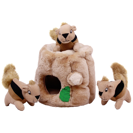 „Hide A Squirrel“ dėlionė užima šunis ieškant cypiančių voverių mediniame kamiene, lavina jų medžioklės instinktus ir suteikia daug džiaugsmo.