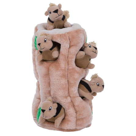 „Hide A Squirrel“ dėlionė užima šunis, kai jie ieško čirškiančių voverių medžio kamiene, taip lavindama jų medžioklės instinktus ir suteikdama daug džiaugsmo.