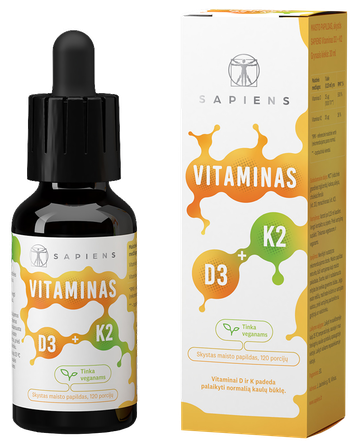 Išgrynintos sudėties maisto papildo SAPIENS Vitaminas D3 + K2 yra skirtas visiems, norintiems papildyti kasdienę mitybą dviem svarbiais vitaminais, kurių natūraliai gauname dažniausiai per mažai. D3 (cholekalciferolis) - tai žmogaus organizmui svarbi D vitamino forma.