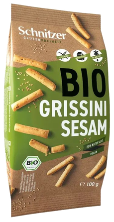 „Schitzer“ ekologiškos duonos lazdelės GRISSINI su sezamais. Be glitimo, be laktozės ir palmių aliejaus. Tai sudėtyje mažai cukrų turintis užkandis. Traškios ekologiškos lazdeles su sezamo sėklomis – sveikesnis užkandis bet kuriuo metu.