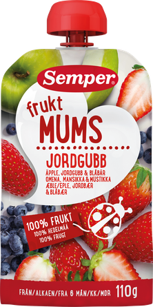 Vaisių tyrė su obuoliais, braškėmis ir mėlynėmis. Supakuota apsaugotoje atmosferoje. Maistinė vertė 100 g: Energinė vertė 193 kJ/46 kcal; riebalai 0,2 g, iš kurių sočiųjų riebalų rūgščių < 0,1 g; angliavandeniai 10 g, iš kurių cukrūs 9 g; baltymų 0,3 g; druska 0,01 g. Laikymas: Neatidarytą produktą laikyti kambario temperatūroje. Atidarytą pakuotę su dangteliu laikyti šaldytuve ne ilgiau kaip 1 dieną. Svarbu! Saugokite savo vaiką nuo kamščiuko. Rekomenduojama iki: žr. pakuotę. Pagaminta Ispanijoje.