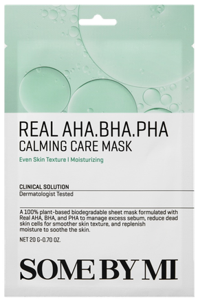 SOME BY MI Real AHA-BHA-PHA Calming Care Mask yra lakštinė veido kaukė, skirta odai nuraminti ir švelniai nušveisti, suteikiant jai gaivią ir lygią išvaizdą.