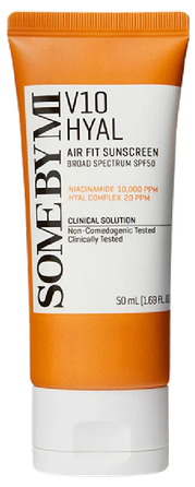 SOME BY MI V10 Hyal Airfit apsauginis kremas nuo saulės siūlo plataus spektro SPF 50 apsaugą nepaliekant baltos spalvos, todėl tai yra puikus pasirinkimas kasdieninei apsaugai nuo saulės.