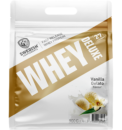 Swedish Supplements Whey Deluxe, 900g. Baltymu milteliai kokteiliui ruošti su saldikliais.