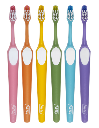 Itin minkštas dantų šepetėlis TePe Nova su užapvalinta galvute ir lanksčiu antgaliu, todėl lengviau pasiekti sunkiai pasiekiamas vietas.