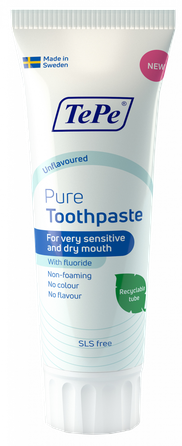 Beskonė dantų pasta su fluoru TePe Pure™ tinka turintiems jautrias dantenas ir sausą burną. Jos sudėtyje nėra natrio laurilsulfato, putojančios medžiagos, kuri gali dirginti jautrius burnos audinius. Skirta komfortiškam dantų valymui. Kasdienė burnos apsauga tinka veganams, nes dantų pastoje nėra kiaušinių ir pieno alergenų. Šios dantų pastos neturėtų naudoti vaikai iki 7 metų. TePe Pure™ yra labai švelni, bekvapė dantų pasta, pagaminta iš nedaug kruopščiai atrinktų ingredientų.