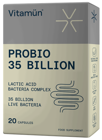 VITAMUN PROBIO 35 BILLION sudėtyje yra 35 mlrd. specialiai atrinktų gyvų bakterijų kultūrų*, natūraliai aptinkamų žarnyno mikrobiome.